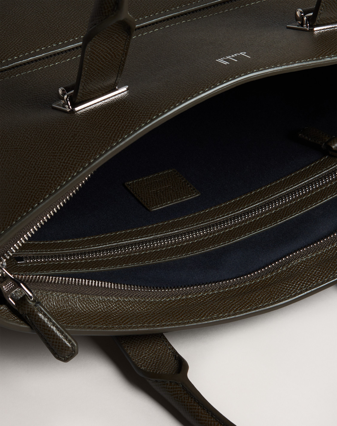 ダンヒルの「カドガン」は型押しレザーを使った、スマートなデザインのシリーズ。こちらのトートバッグも通常のトートよりも随分マチが薄くデザインされており、かさ張りません。
